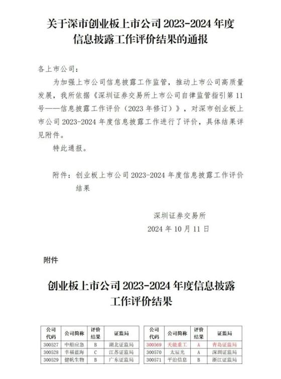 2024年10月,天能重工凭借在信息披露、投资者关系管理等方面的卓越表现,荣获深交所信息披露工作的最高考核评级—A级、第二十六届上市公司金牛奖“金信披奖”、中国上市公司协会“2024年上市公司董事会优秀实践案例”等多项荣誉。这是天能重工自转型为国有企业控股上市公司以来,首次获得“A”级信息披露考核评价,体现监管层、广大投资者以及资本市场对公司持续规范运营、重视信息披露并深切关注投资者利益的高度信任与认可。